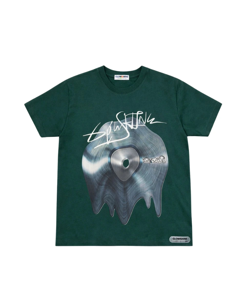 O destaque da camiseta fica por conta da estampa frontal: um disco de vinil que parece estar derretendo. Na parte de cima do vinil, a frase "GLOWSHINE" está escrita em um estilo de pichação, enquanto a frase "MUSIC LABEL" está escrita na parte inferior. A peça também conta com outras estampas menores nas mangas, que adicionam ainda mais personalidade.