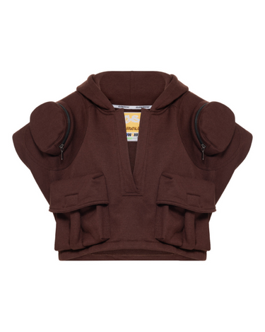 Este cropped apresenta bolsos cargo frontais, ideais para armazenar pequenos itens essenciais com praticidade. Equipado com um capuz, oferece proteção adicional em dias mais frescos. As ombreiras com bolsos adicionam um toque moderno e funcional ao design. Com um bordado de urso nas costas, acrescenta um elemento de estilo único à peça. O acabamento em galoneira confere um visual refinado e durável. Feito com moletom de alta qualidade, oferece conforto e estilo durante todo o dia.